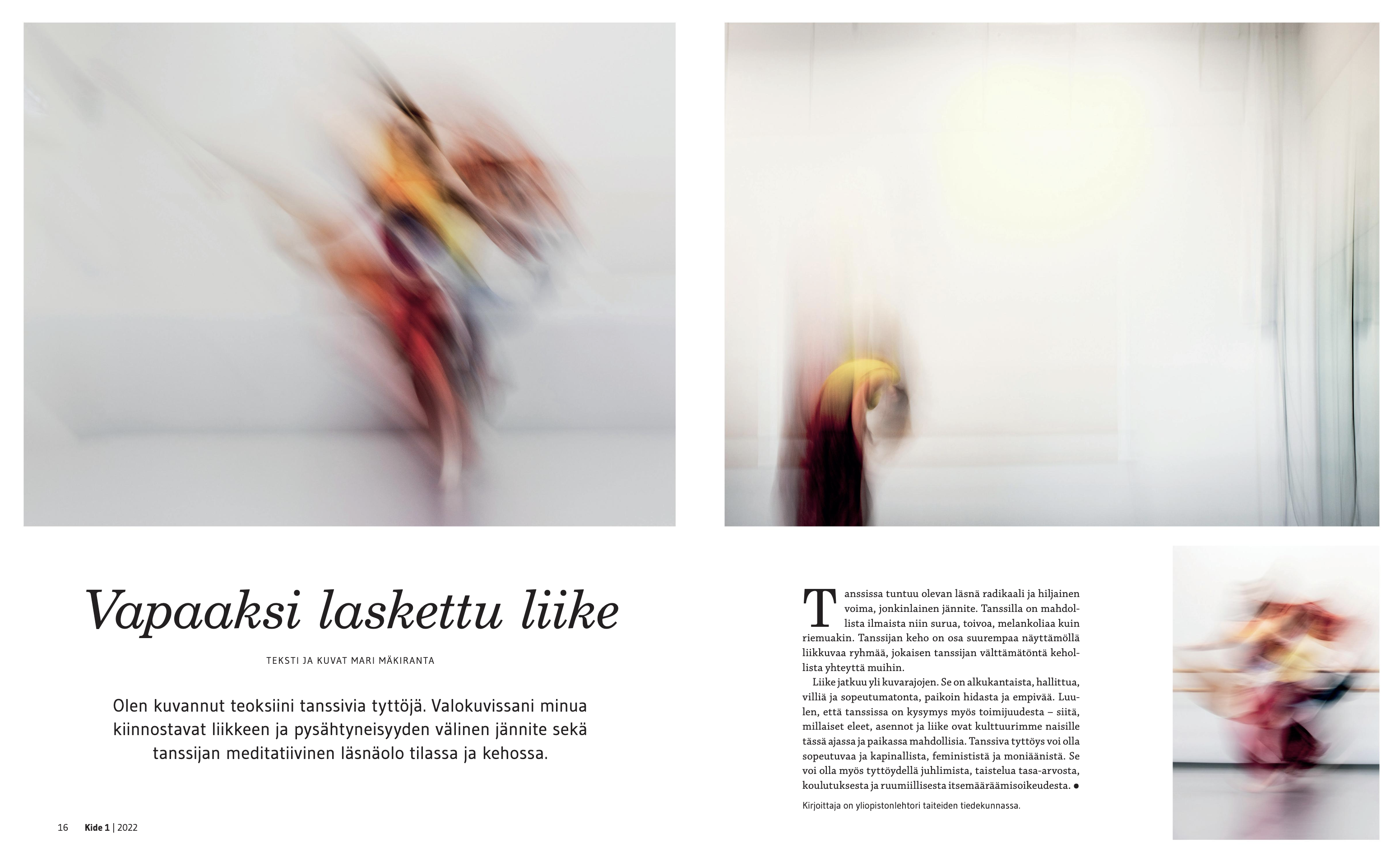 2021-2022, Girls Who Dance, Exhibition in Valo Gallery, Arktikum & Visual Essay in Kide-journal Posted on April 5, 2022 by www.marimakiranta.net Being in the Air, Gallery Exhibition curated by: Pirjetta BranderKide-journal: Editor in chief: Marjo Laukkanen Lay-out: Reetta Linna Related
