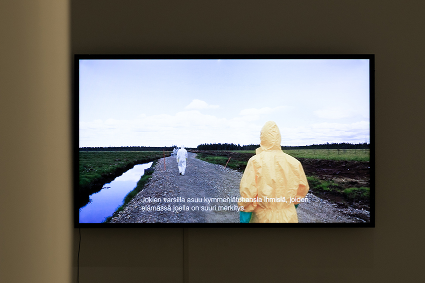 The video works on display combine the collective’s sampling rituals and walking performances, in which the effects of mining on nature become tangibly visible. The Kevitsa nickel-copper mine is located just over 30 kilometres north of Sodankylä, right on the boundary of a Natura 2000 area. The video work Orange Dust illustrates how pollutants from the mine spread beyond its fences into this protected area. In turn, the Kittilä gold mine channels its wastewater via a discharge pipeline into Loukinen, a tributary of the protected Ounasjoki River. The performance seen in A Twenty-Five Kilometre Walk took place on top of the discharge pipeline road, which had been constructed in nature without official permission. Through the performance, members of the collective opposed environmental destruction and expressed compassion towards nature.